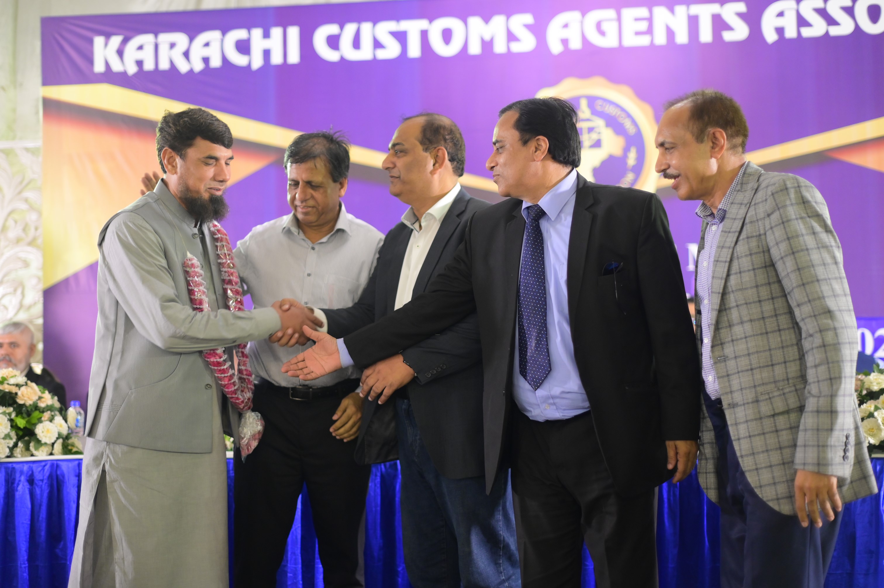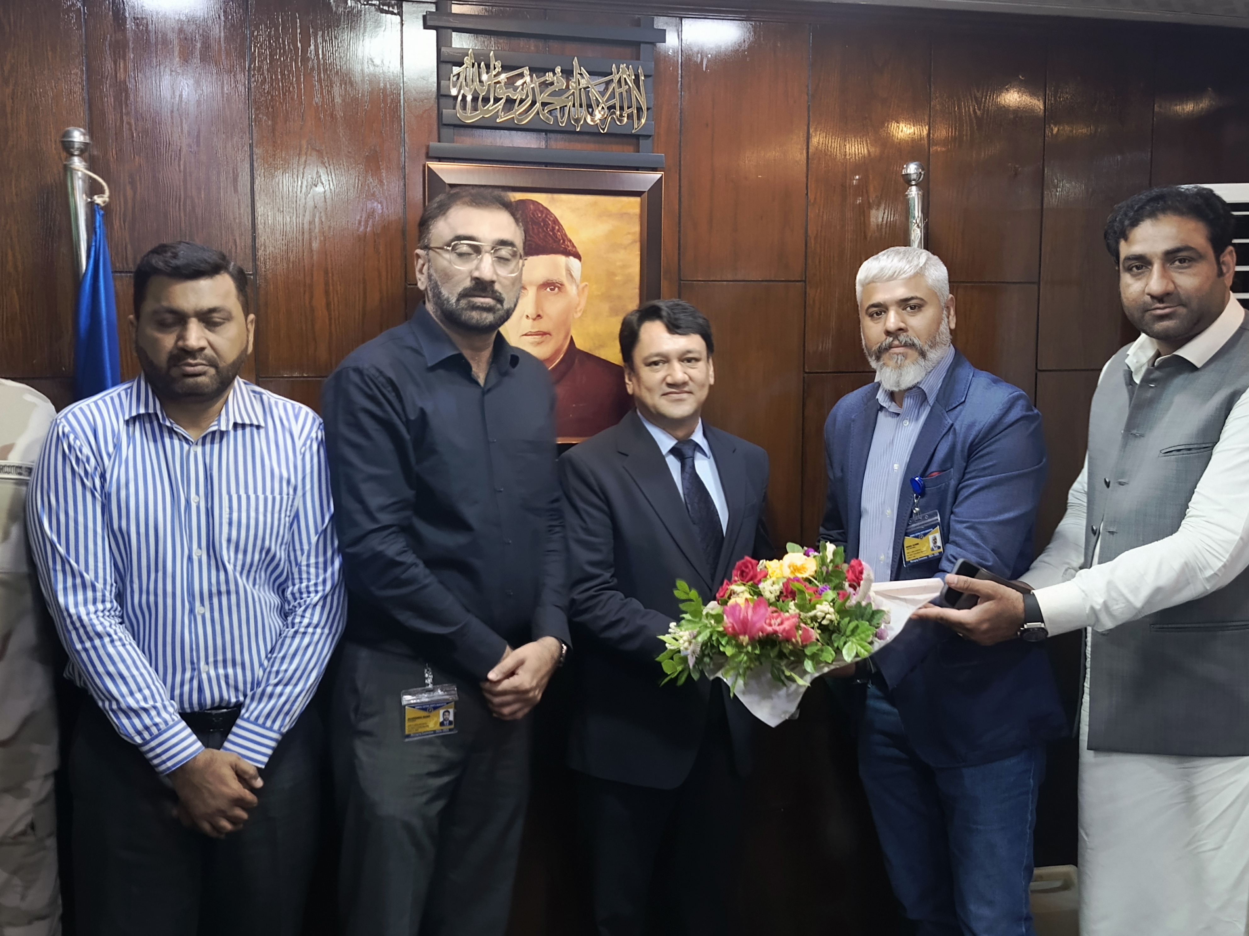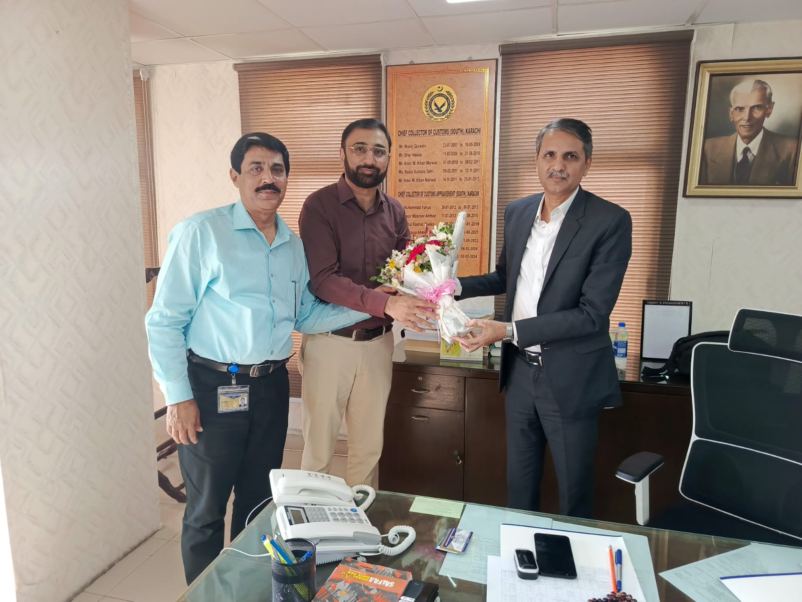 Mr. Muhammad Aamir (President) and Mr. Mansoor Ali (General Secretary) presenting Bouquet to Mr. Muhammad Jamil Nasir the Chief Collector of Customs South (Appraisement) Custom House, Karachi conveyed the congratulatory message on behalf of KCAA