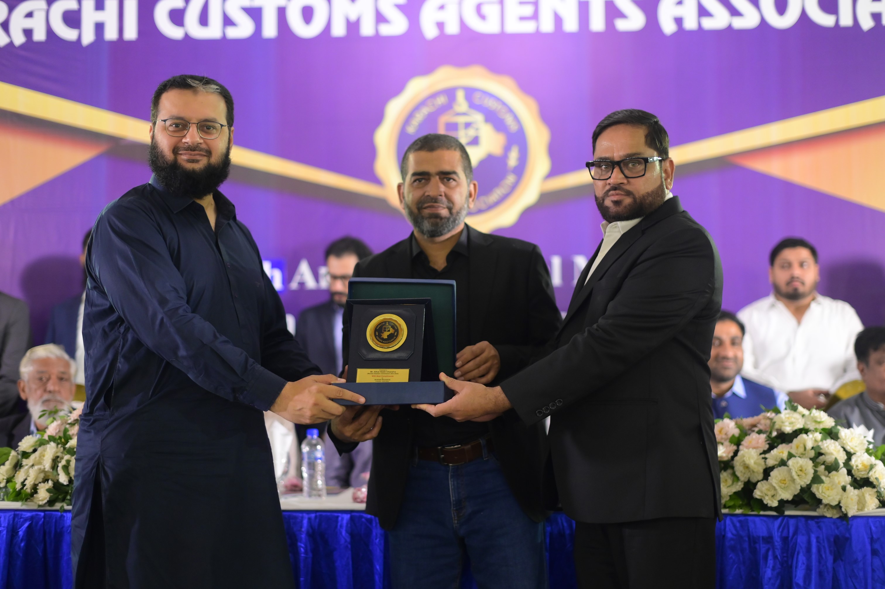 Mr. Arshad Khurshid (President) & Mr. Asif Sakhi (Chairman CAA) presenting Shield to Mr. Waqas Anjum on behalf of Mr. Asif Iqbal Wahidi the event of 17th AGM Meeting held on 30th September 2024 at Majestic Banquet Karachi.