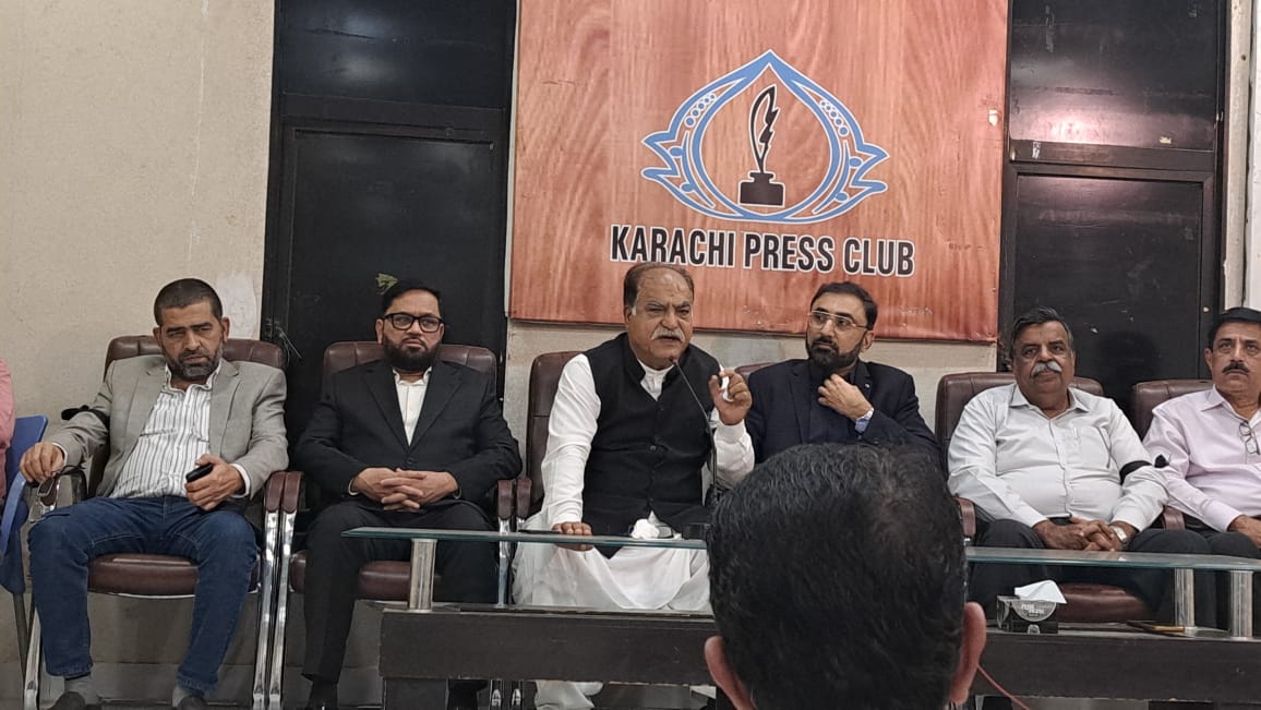 Mr. Muhammad Aamir (President KCAA), Mr. Mansoor Ali (General Secretary) Mr. Saif Ullah Khan (Chairman APCAA) and Mr. Asif Sakhi (Vice President FPCCI) on the occasion of Press Conference at Press Club on the issue of suspension of 46 Customs Agents Licen