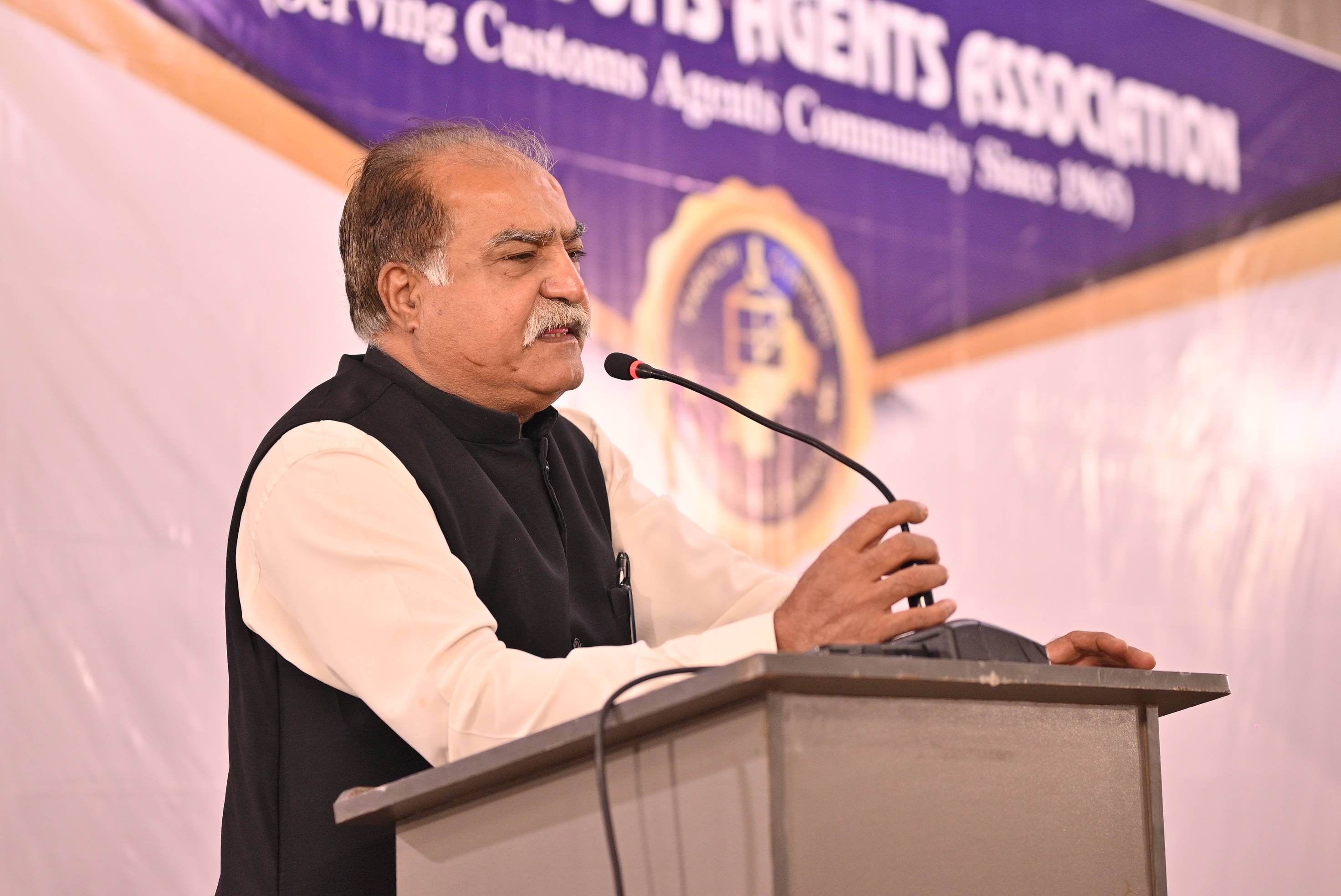 (Late) Saif Ullah Khan (Chairman) while addressing the participants on the occasion of Extra Ordinary General Meeting called by KCAA on the issue of suspension of 46 Customs Agents Licenses by the Customs Authorities